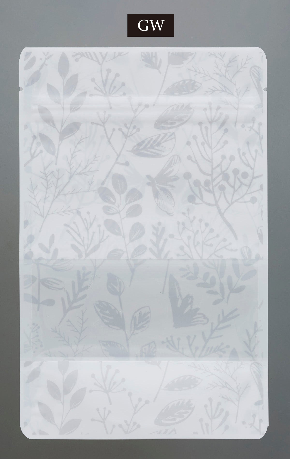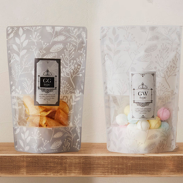 中身を主役にするボタニカル柄デザイン。自然な彩りで食品の魅力を引き立てます。白とグレーが基調の2カラーご用意。