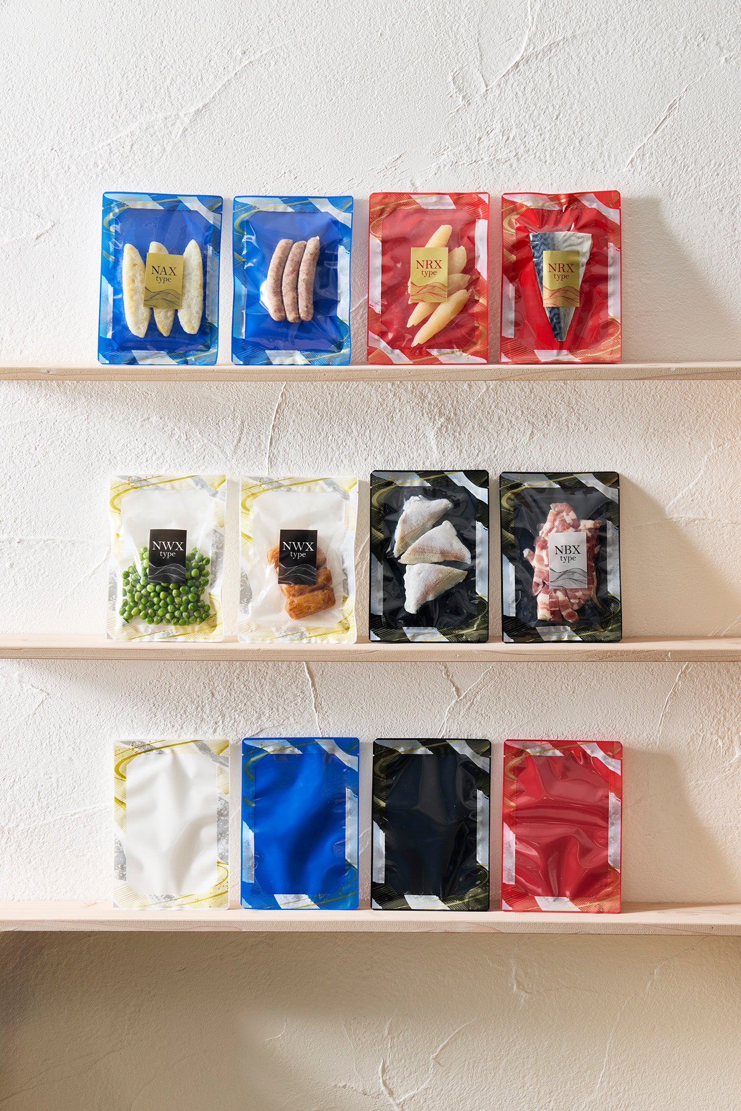 食品トレイ風のデザインをあしらったバリアナイロン三方袋です。上品な和柄デザインが中身を引き立てます。全4色の2サイズご用意。