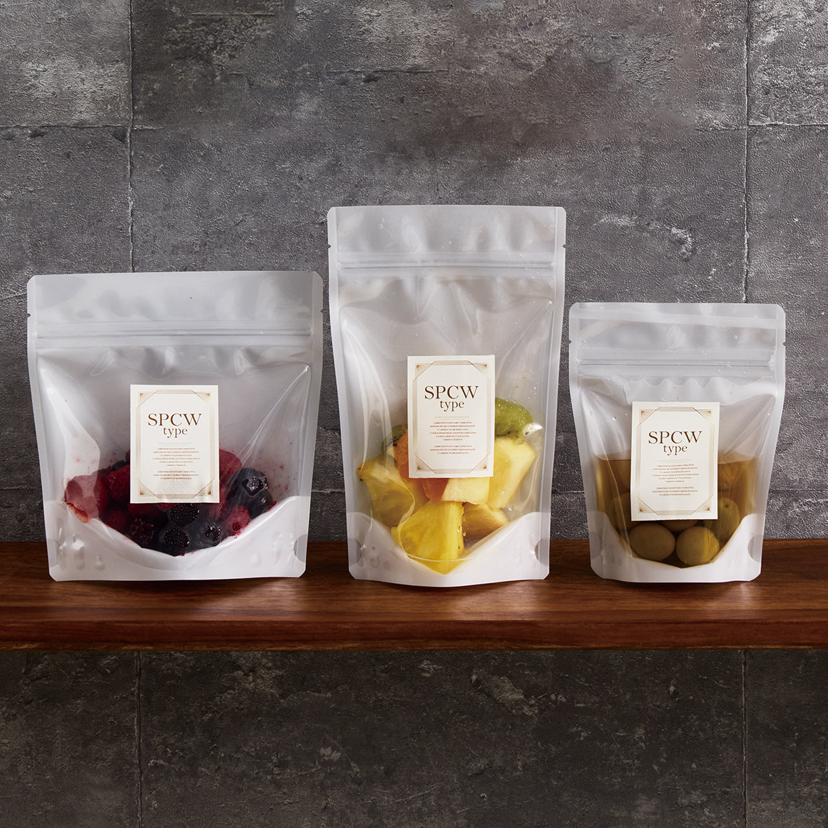中身が見える透明な表面と、すっきりとした白い背面のデザインで、どんな商品にも合わせやすく、チャック付きで保存にも便利です。自立性があり、売り場でのディスプレイ効果が期待できます。