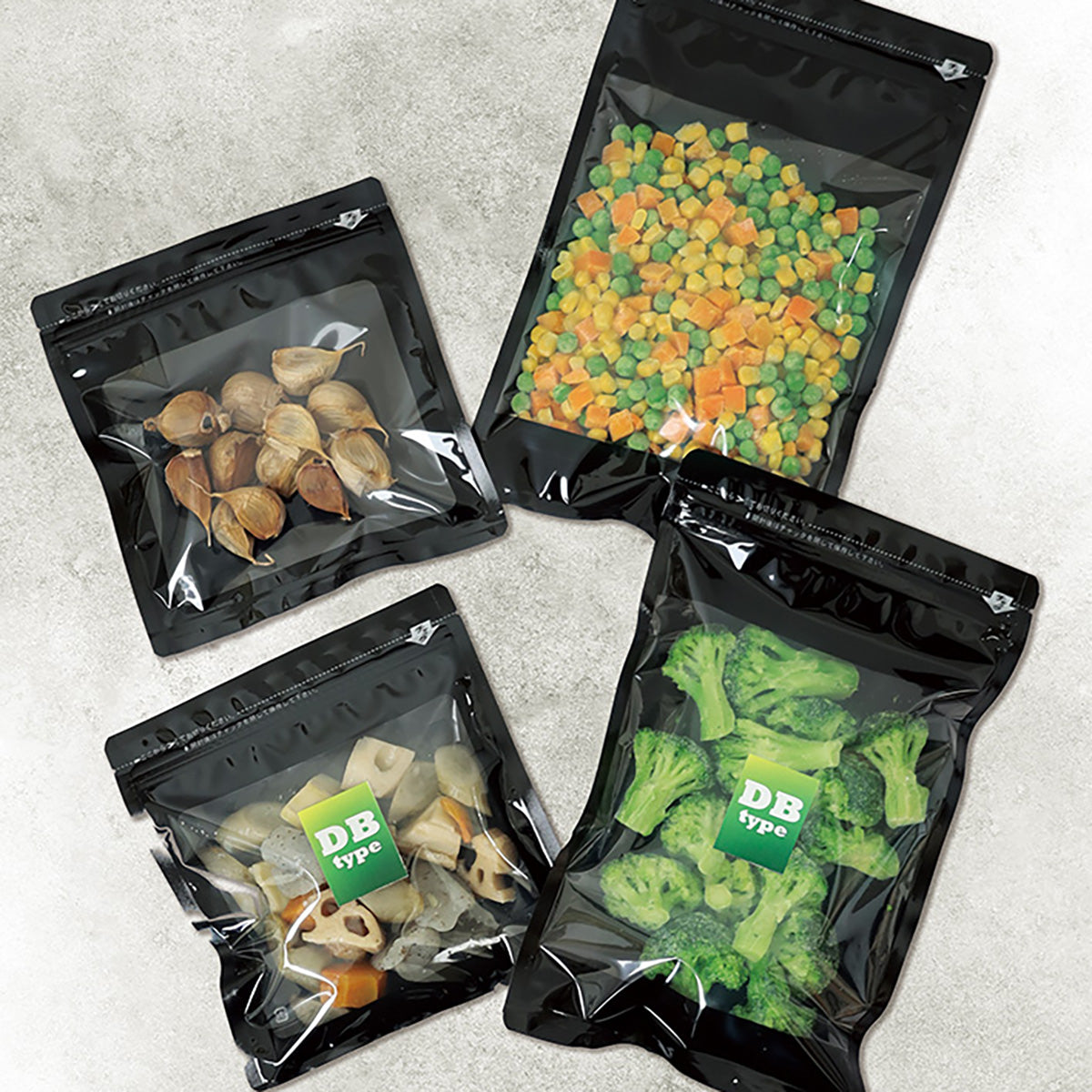 ナイロンポリで黒色のチャック付き三方袋。バリア性もあるので冷凍食品や農産加工品をはじめ食品全般に使用できる規格袋です