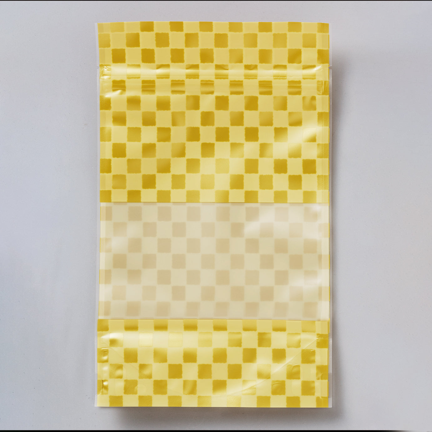 マットバリアOPに市松模様を印刷し、白と金の2タイプで高級感を持たせ、より商品を引き立たせるオリジナル規格袋です。
