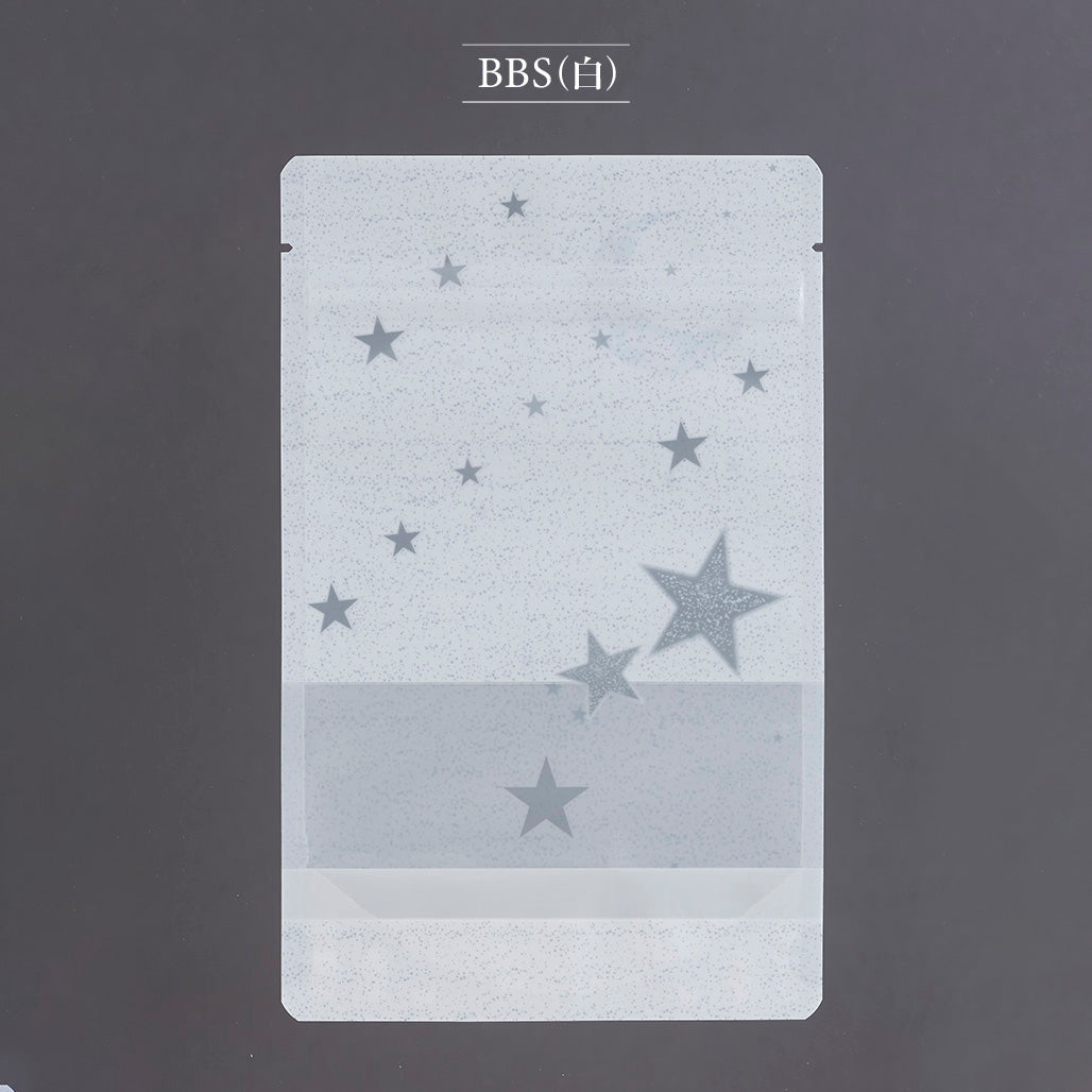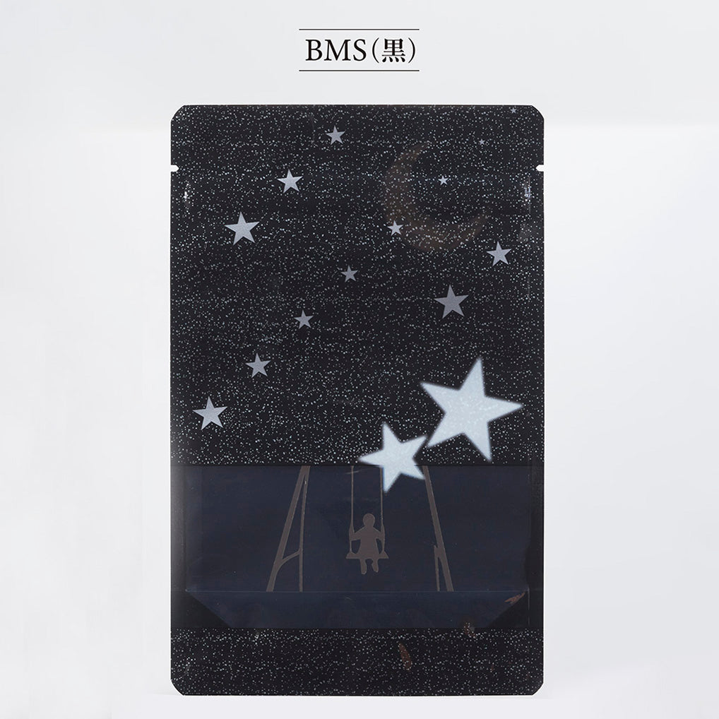黒は神秘的でシック、ブランコに乗る少年の隠しデザインなど遊び心も散りばめられています。白は優しくファンタジックな雰囲気を醸し出すキュートなデザインです。高付加価値商品のパッケージに最適なチャック付スタンドパックです