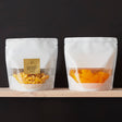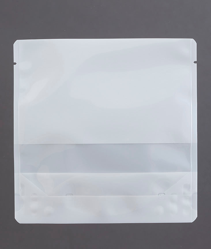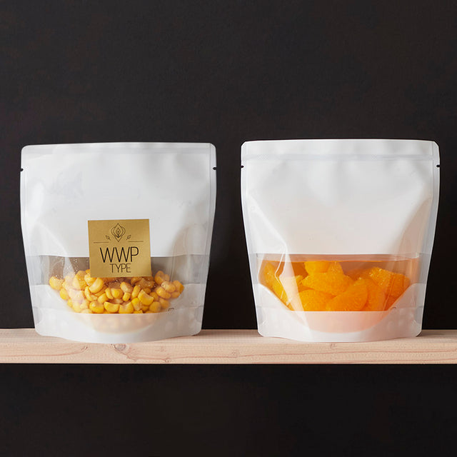 白色のバリアナイロンスタンドパック。窓を設けているので中身もしっかりとみえます。